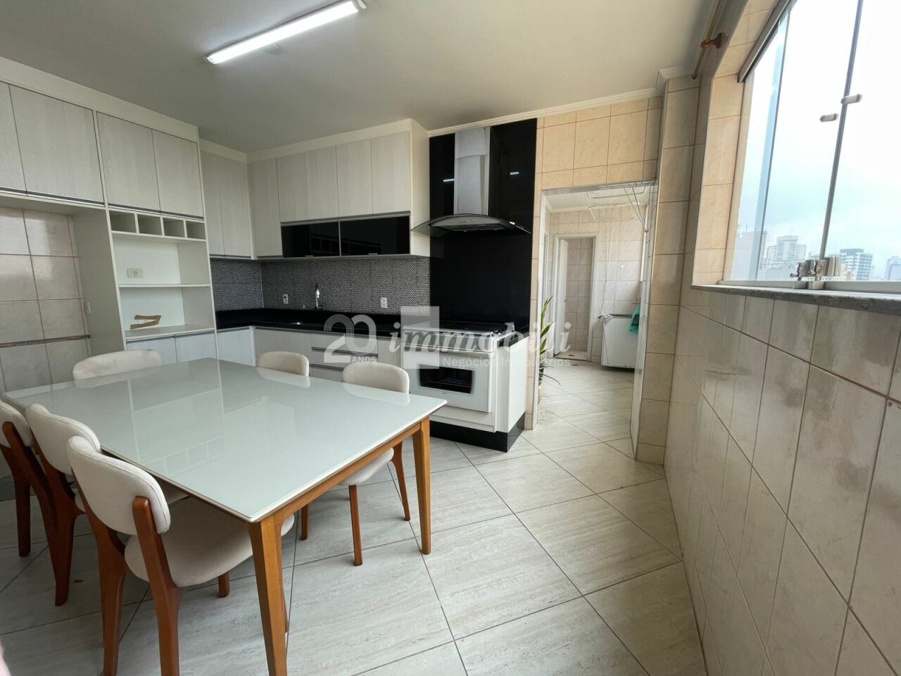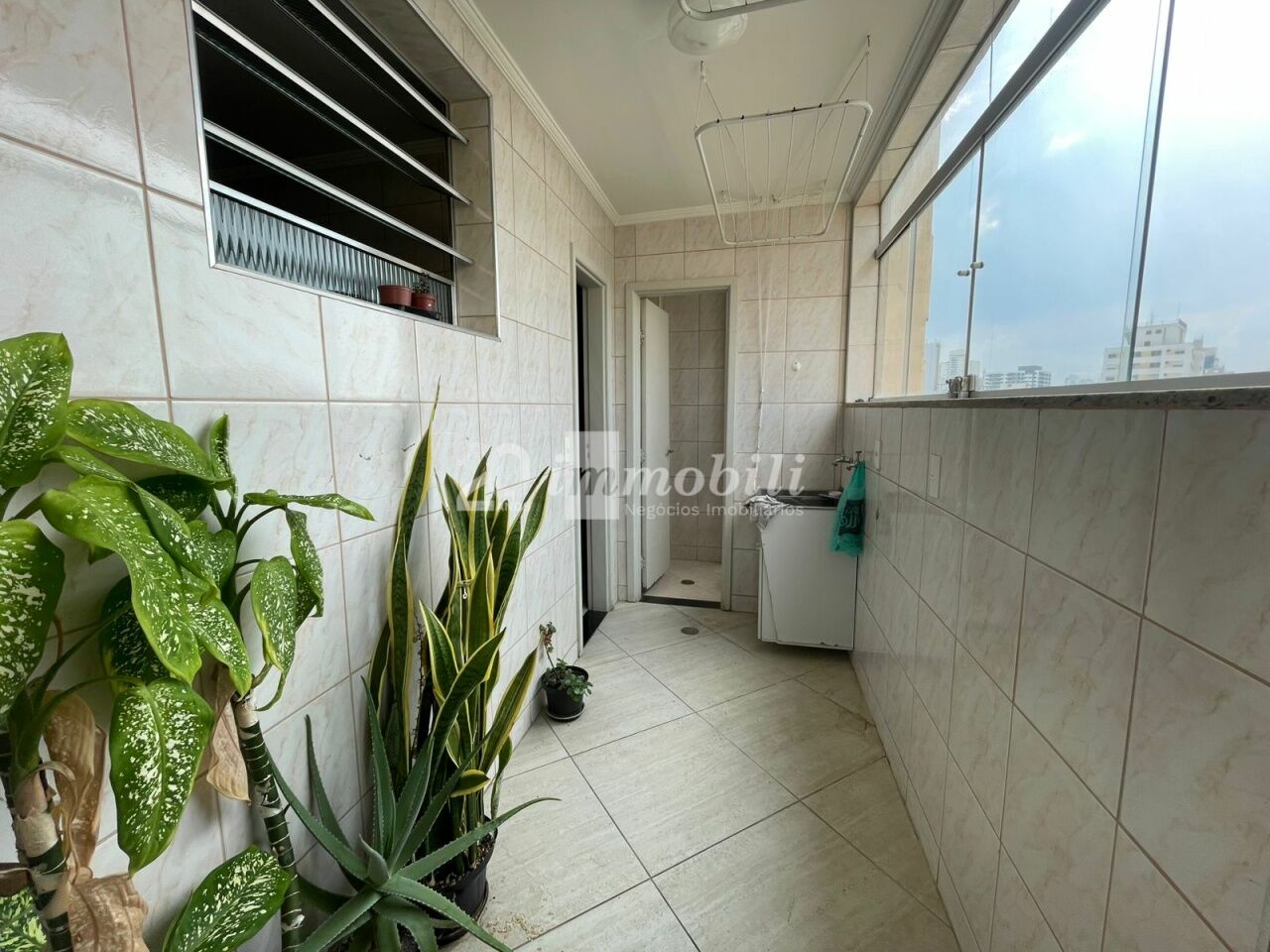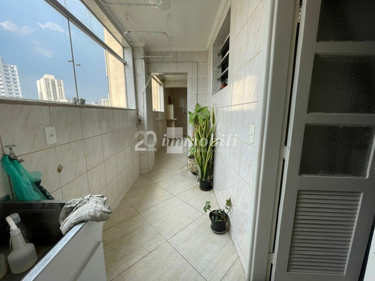 Apartamento reformado com sacada, cozinha, sala, banheiro.